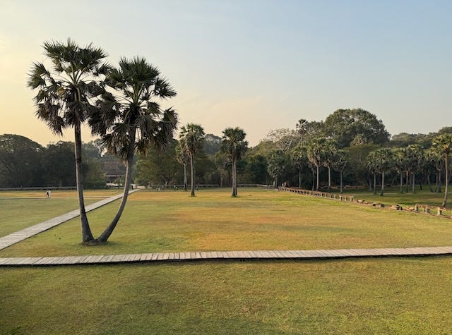We walk around for an hour before the crowds appear, blown away by the architecture and the soft morning light. Barring the palm trees, the vast expanse of grass around the site has a curiously English look to it like an 18th century landscape painting.